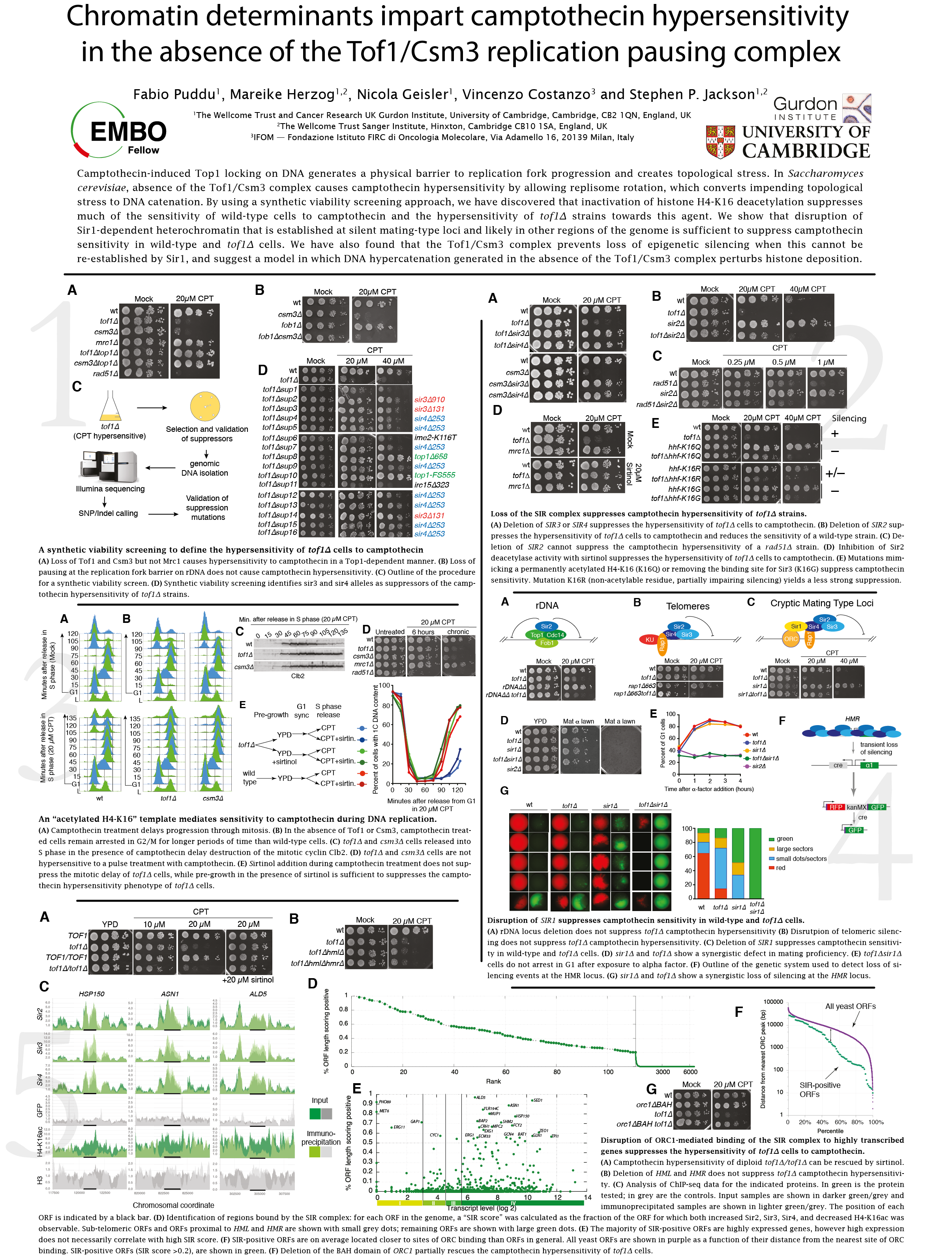 2016-07 | Fabio Puddu, Mareike Herzog, Nicola J Geisler, Vincenzo Costanzo and Stephen P. Jackson | Chromatin Determinants impart Camptothecin hypersensitivity in the absence of the Tof1/Csm3 replication pausing complex | At the Intersection of DNA Replication and Genome Maintenance: from Mechanisms to Therapy; Trieste, Italy |